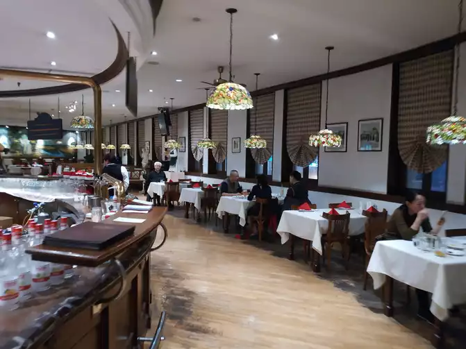 This café has been meticulously restored, preserving the original appearance and interior structure of this historic building. A metal "large copper coin" sculpture sits on the ground at the entrance, attracting many tourists.