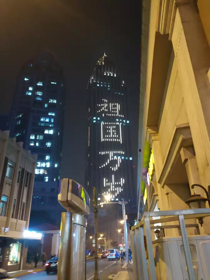 When we left, my wife bought some snacks to go from the pastry shop on the first floor. The night view was beautiful, and the building next to us was lit up with the words "Long Live the Motherland"!