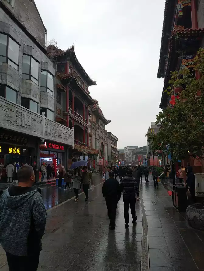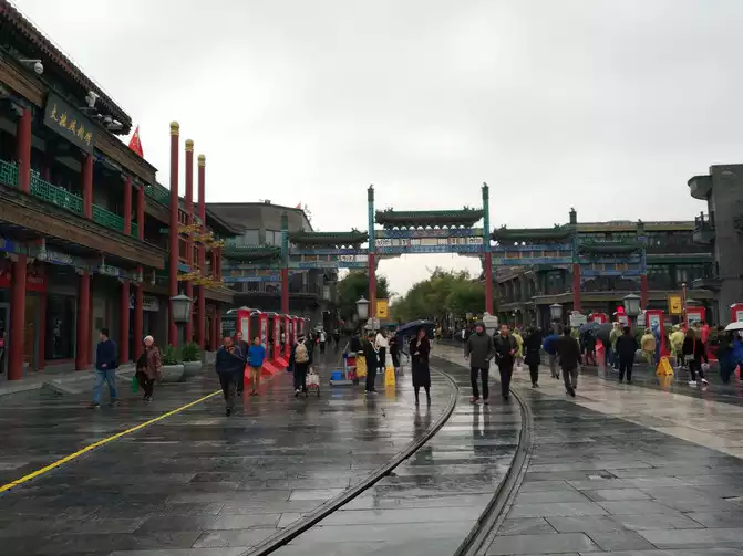 After waking up naturally, we headed to Tianjin Station to catch the high-speed train to Beijing South Station. Trains run frequently, and we'd purchased our tickets online in advance. When we arrived at Tianjin Station, there was still some time before our departure time. I had breakfast while waiting for the train. The high-speed train was fast, and it took about half an hour to reach Beijing South Railway Station. I took a taxi and headed straight to the Jingtailong Hotel, where I'd been staying for the past few days. It's located on Zhushikou East Street, right near the south entrance of Qianmen Street. After checking into my room and putting down my luggage, I took a short break before strolling over to the nearby Qianmen Pedestrian Street. The main reason I chose this hotel was for its convenient location for shopping and dining. The sky turned overcast and a light drizzle began, but that didn't stop us from exploring. Qianmen Pedestrian Street stretches approximately 800 meters from the outside of the Zhengyangmen Arrow Tower in the north to Zhushikou East Street in the south. It has been Beijing's most famous commercial street since ancient times.