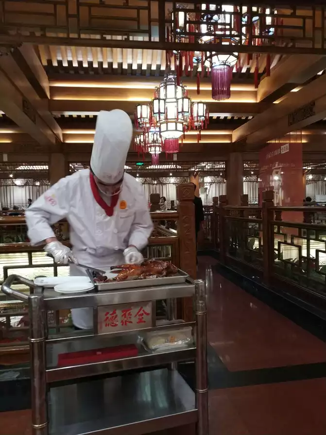 Before we knew it, it was getting dark and we arrived at Quanjude Roast Duck Restaurant for dinner. Quanjude is a well-known Chinese time-honored brand. It was founded in 1864 (the third year of Tongzhi in the Qing Dynasty) and has achieved great development after several generations of entrepreneurial struggle. I have been to Beijing many times before and have eaten Quanjude Roast Duck many times, but my wife still wants to try it again. When we entered the hall, there were many people queuing up, so we took a number and sat down to wait. While waiting for a table, you can see the oven in the glass room and the chefs busy roasting ducks. The oven door is wide open, revealing a blazing fire. The golden roast ducks make the waiting people salivate. After waiting for almost an hour, it is finally our turn and we sit down at a square table on the second floor. I told the waiter the dishes I had chosen while waiting for my table and placed my order. The duck tasted okay, though a bit pricey. However, watching the chef slicing the freshly roasted duck on a cart next to the table while drinking beer made me quite happy!