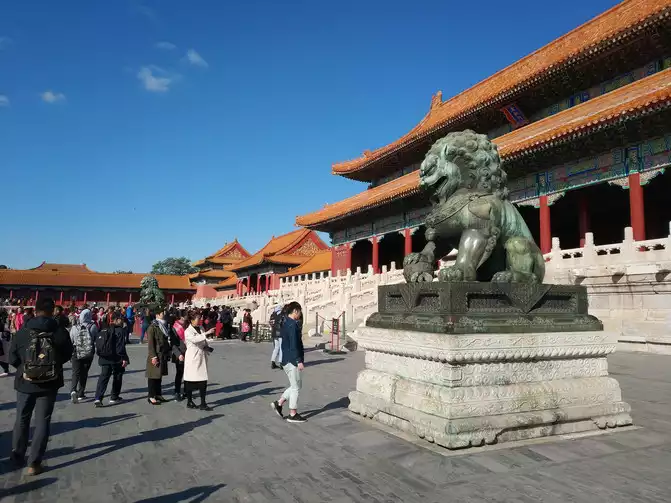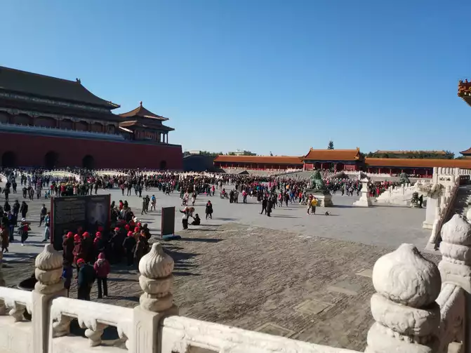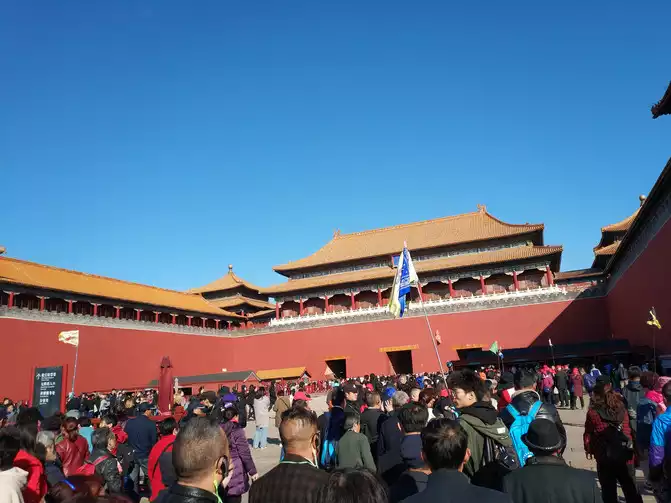 The sky was clear today. After having some breakfast in the restaurant next to the hotel lobby, I took a taxi to the Forbidden City. In fact, the walking distance from the hotel to the Forbidden City was less than 3 kilometers, but it took nearly an hour to get to Donghuamen by taxi. It was really "traffic jam"! I bought the tickets online yesterday. The entrance to the Forbidden City is at the Meridian Gate, so I took an electric car from Donghuamen to the outside of the Meridian Gate. It wasn’t far to walk, and the electric car arrived in a few minutes.