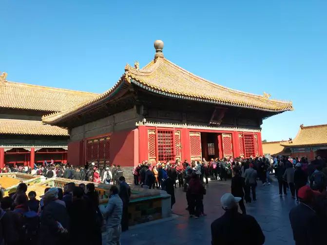 The Forbidden City was packed, but the number of visitors allowed was limited, so it didn't feel crowded. There were many groups, and the queues were noisy, but the lines for individual visitors were very short. After taking a few photos outside the Meridian Gate, we soon passed through the gate and entered. To learn more about the Forbidden City, we rented two electronic audio guides, which automatically played explanations as we visited various places. The Forbidden City, also known as the Palace Museum, served as the imperial palace for the Ming and Qing dynasties. It is one of the largest and most complete ancient wooden architectural complexes in China and even in the world. Covering a vast area, it houses over 70 palaces of various sizes and 9,999 and a half houses. These magnificent buildings can be divided into two major parts: the Outer Court and the Inner Court.
