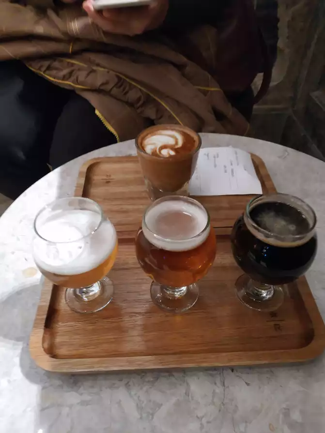 Reluctant to leave, we ordered a cup of coffee and three cups of freshly brewed coffee beer of different flavors.
