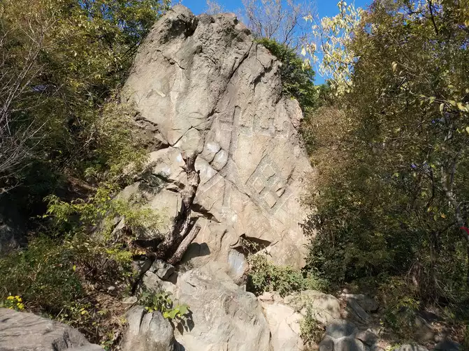 In the middle of the mountain, I saw the place where Mr. Mei Lanfang used to play. A huge plum character was carved on the rock, with two small characters Lanfang below.