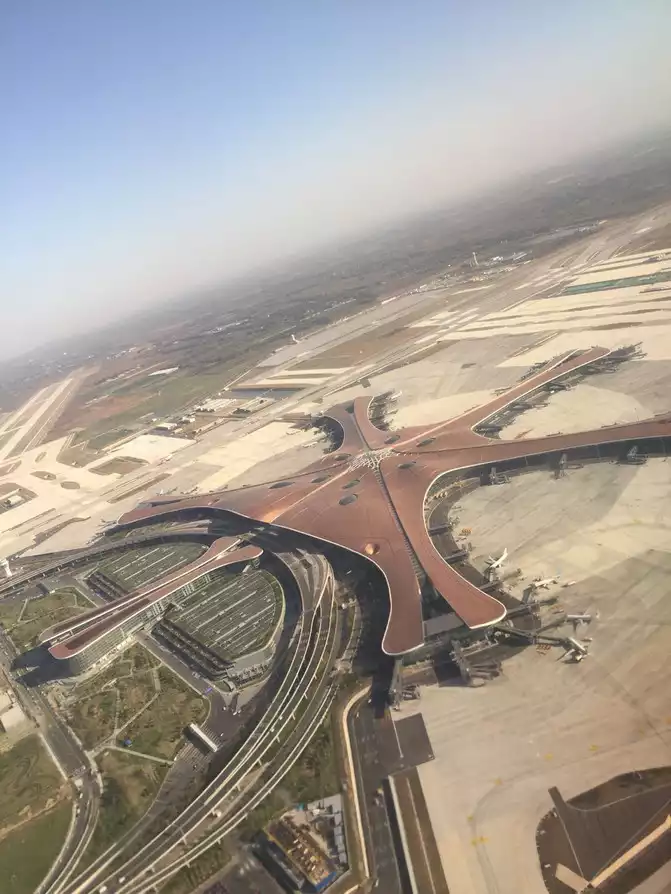 LP's seat is close to the window. After the plane takes off, you can clearly overlook the Daxing Airport building like a starfish in the air.