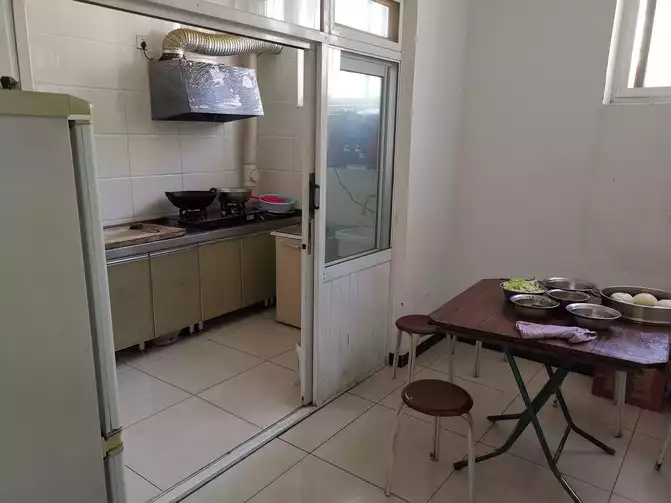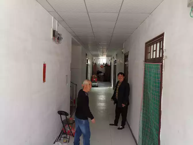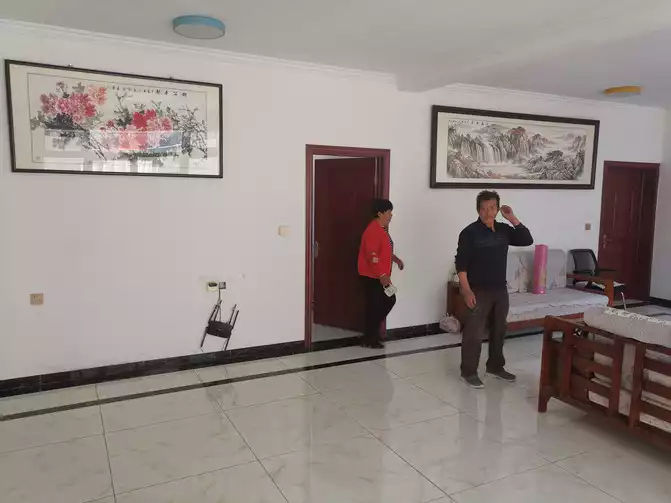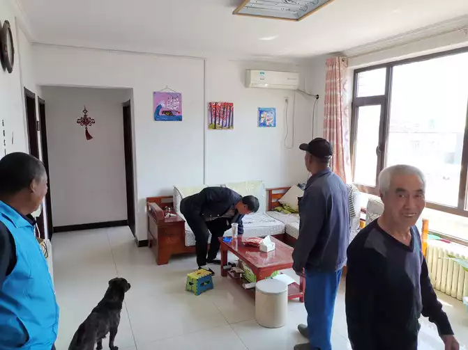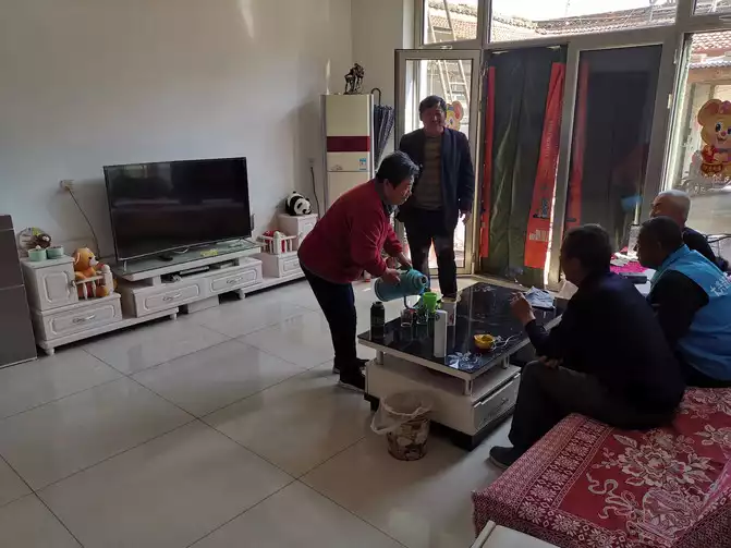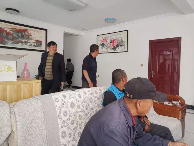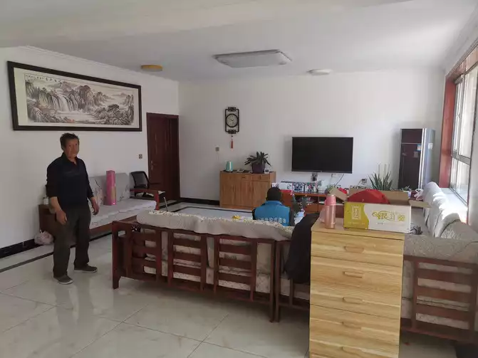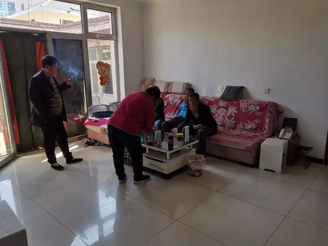 Brother Xiang's living room is on the third floor and isn't as big as the captain's. Brother Sheng's wife passed away early, and now his son and his family live with him. His daughter-in-law serves us tea and water, and the family lives a happy life.