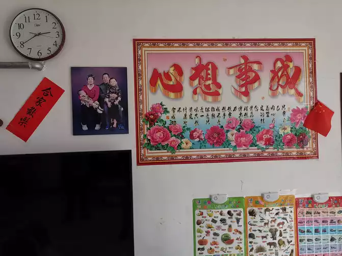 A photo of Brother Yuan and Sister Yuan with their grandchildren hangs on the wall.