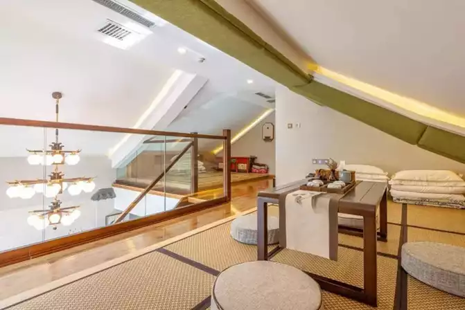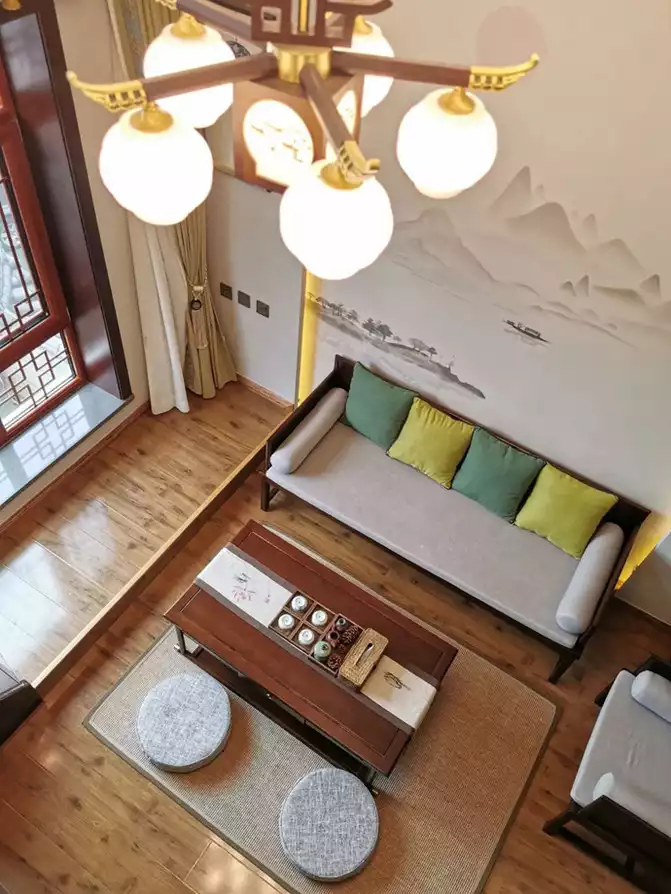 The combination of dark wood and blue ink color sets this loft apart visually from Chuyun, especially the ink paintings on the wall and the three-dimensional corner eaves, which give it a more gentlemanly feel.