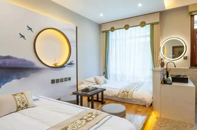 Huamu has the same room type as Jinmo but different decoration. It pays more attention to the display of Manchu small objects, such as ornaments in the lattice cabinets, storage boxes with brocade satin, blue and white porcelain patterns on the wall, and old lacquered cabinets... Perhaps the owner of the B&B did not regard it as just a place to sleep.