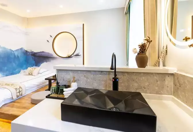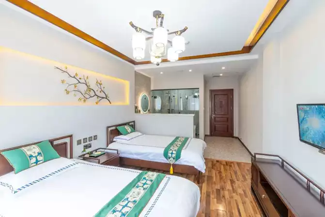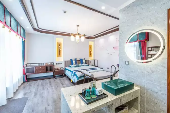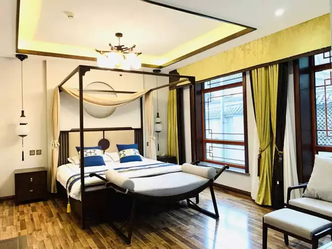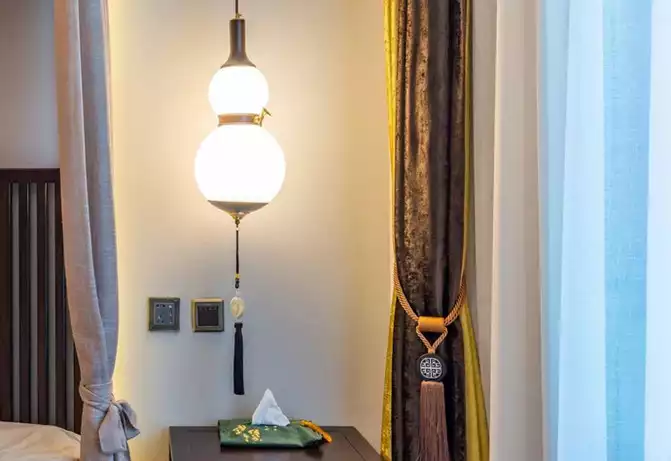 Confucius once said: "A solemn mind leads to a relaxed body; a solemn heart leads to a respectful demeanor." This magnificent king room exudes a sense of grandeur and comfort from the first glance, featuring a curtained bed, yellow-brown curtains, and an antique-style gourd-shaped bedside lamp...every detail exudes the aristocratic atmosphere of the Qing Dynasty.