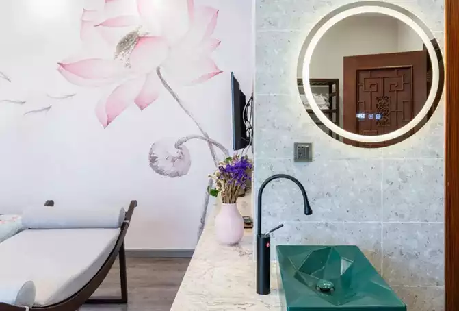 Yuexi means the moonlit night. The main colors are sky blue, lake blue, and deep sea blue. The sunlight pours into the house from the window, gradually brightening the blue here, and finally reflecting on the painting of fish playing with lotus on the opposite wall, adding more poetic interest.