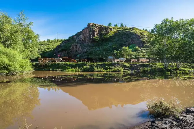 After watching the sunrise, we drove down the mountain. Not far down the rolling mountain road, we saw Princess Lake. The reflection of the water was crystal clear. It was early morning, and a group of cows walked forward by the lake. The pastoral scene before our eyes was breathtakingly beautiful.