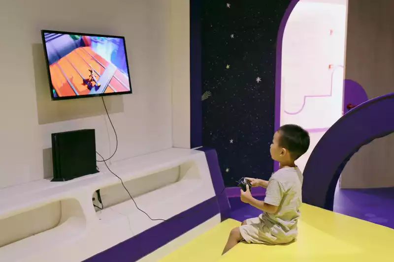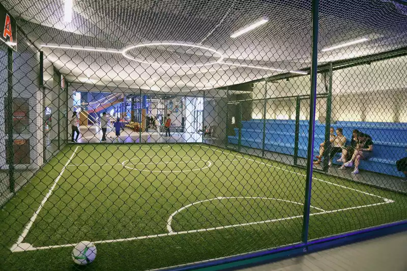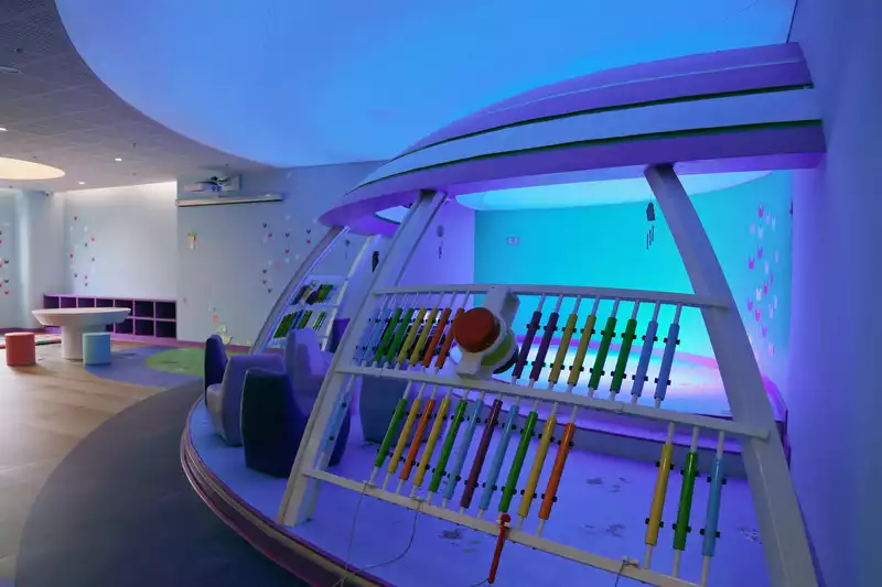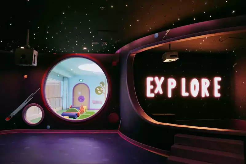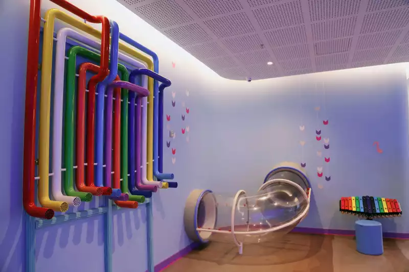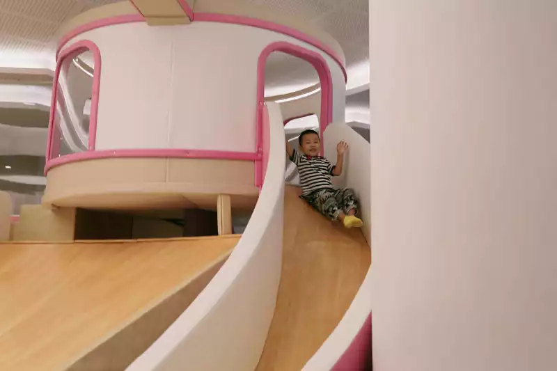 A dazzling glass corridor connects the main hotel building to the Playground. The soft-plastic flooring ensures that running children won't get hurt even if they fall.