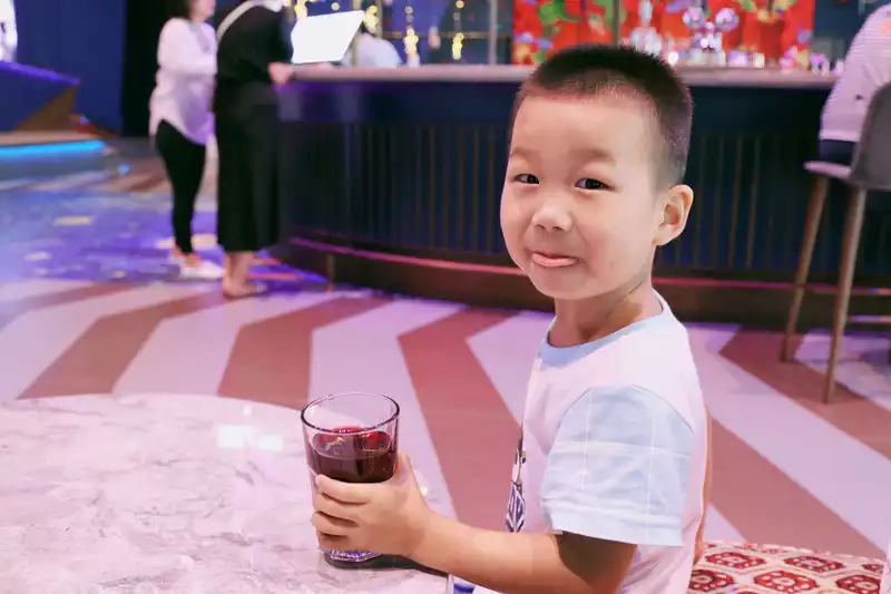 After watching it once, the baby learned to order by himself. He climbed up the high chair to order a glass of juice from the staff and didn't forget to say "thank you" when he received it.