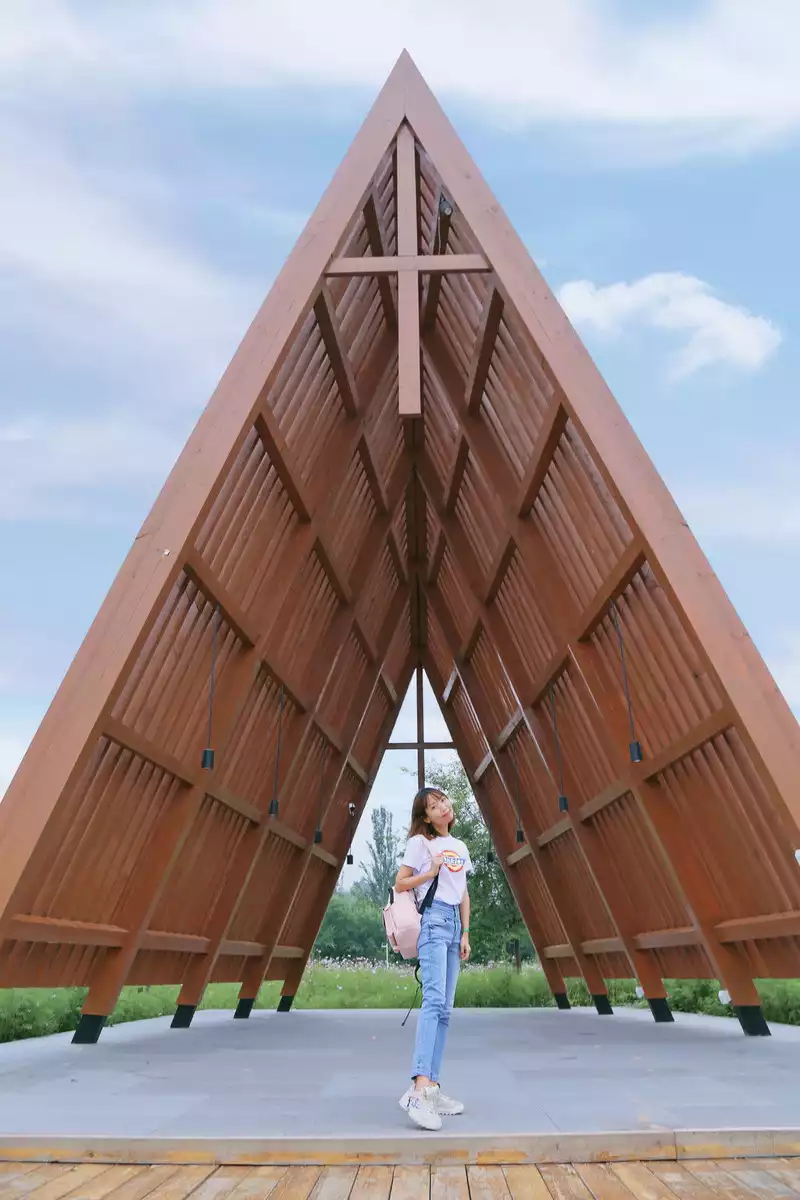 The center of the romantic flower sea is a wooden church with a very stylish design, and there is also a glass cafe next to it.