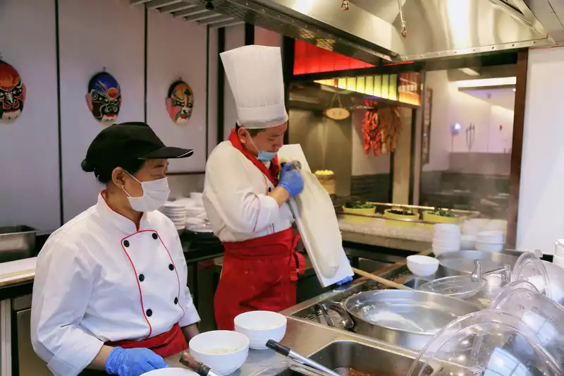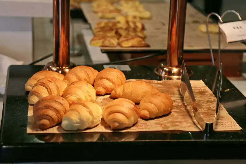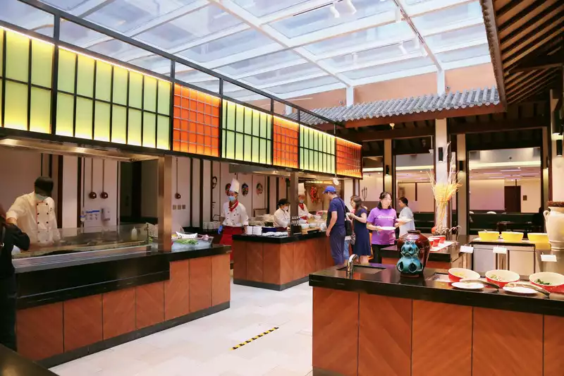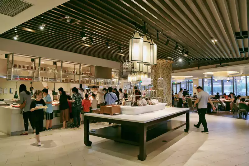 A diverse array of food is served here for all three meals daily. The Western section offers bread, salads, roast chicken, and the children's favorite, fried chicken and fries. The Chinese section offers rice, cold dishes, various stir-fries, and sliced noodles. The dessert section also boasts a wide variety of ice cream and cakes.
