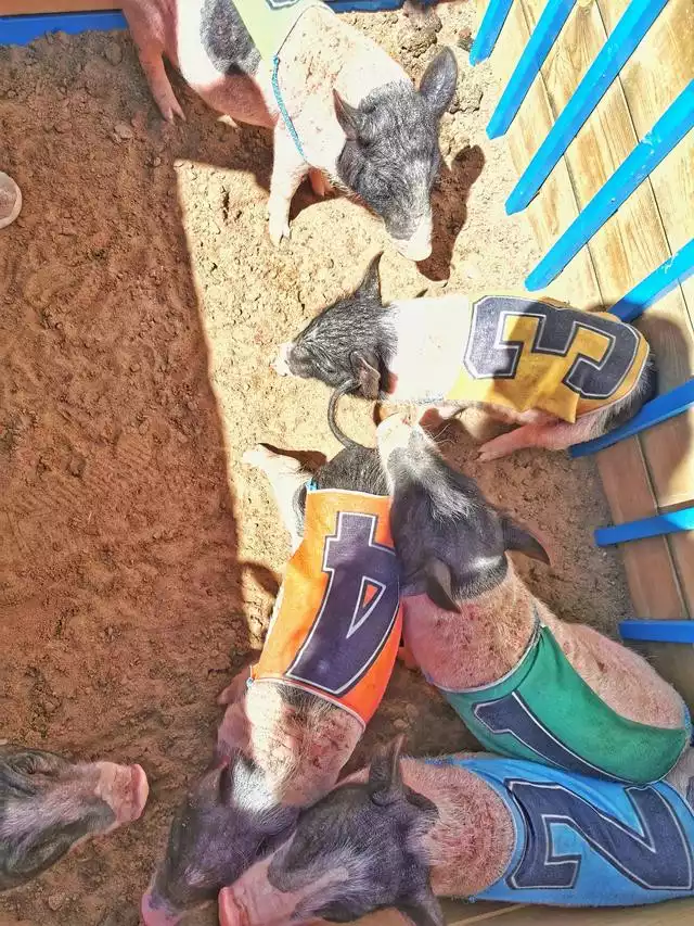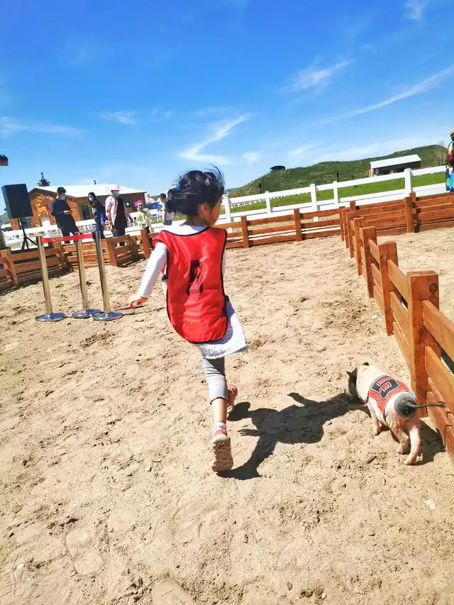 The chestnut one is our Northeast draft horse, 25 years old this year, a female, worth 150,000 yuan. Each horse has a lifespan of 25-30 years. After a ride, I found these famous horses incredibly well-behaved and clean, with absolutely no odor at all. For children afraid of larger horses, the adjacent pony park offers a more intimate experience with these ponies. Alpacas, camels, pigs, and ducks—common animals—have been given a novel twist in China's Horse Town. 5. Pig racing is a great animal-friendly game that doesn't harm animals while still allowing children to fully engage. While driving the pigs around in circles, children experience the joy of competition and participation. Even if they don't win in the end, the fun of racing with the pigs will stay with them as they grow up.