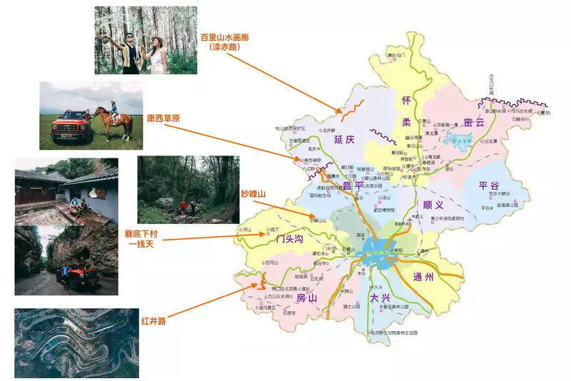 Such diverse scenery as shown above is all in Beijing. And this is just a small part of the scenery in the suburbs of Beijing. Looking at the scenic spot distribution map below, one can’t help but sigh at the vastness of the imperial capital!