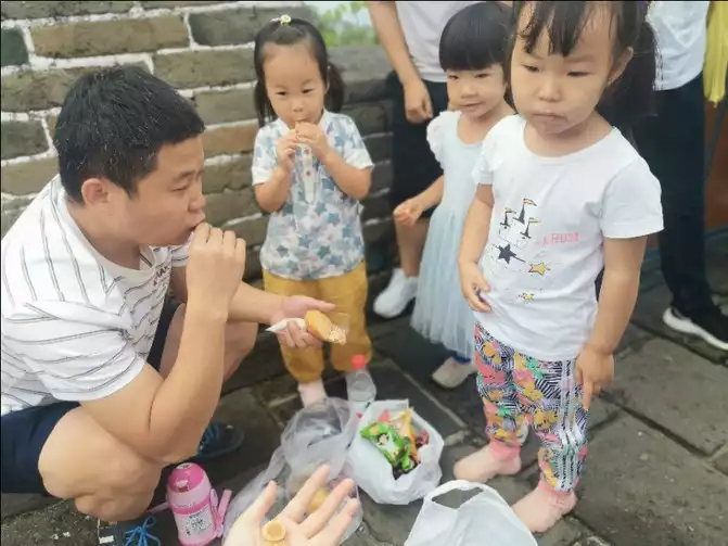 Have a picnic on the Great Wall and clean up after eating. Protecting the Great Wall starts from childhood! After coming down from the Great Wall, we were exhausted and needed to refuel immediately. So, we had another hearty meal. Every weekend, I gain three pounds! After that, we'll talk about losing weight!