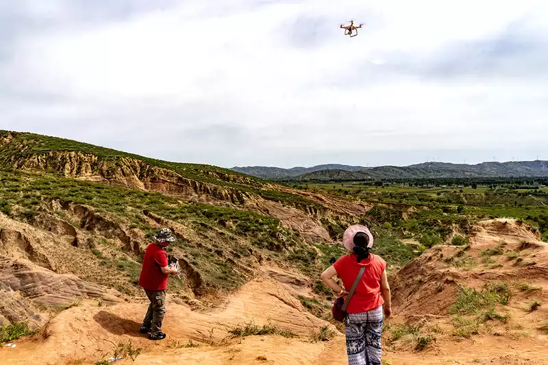 Leave Qikou to visit the natural landscape of Wave Valley in Jingbian County, Yulin City, Shaanxi Province. Jingbian Wave Valley is relatively close to Yan'an. I have always thought that it is a scenic area with boundaries. The area is a large Wave Valley (locally known as Jingbian Red Sandstone Canyon), a treasure deep in the mountains. It was formed by wind and water carving sandstone for millions of years. The texture of the rock sand is like waves, with circles and clumps. It is really a Feng Shui treasure land. I sigh at the magical carvings of nature and the magnificent and continuous Danxia landforms. I enjoy taking pictures here. Teacher An's small plane fully demonstrated his expertise and took a panoramic picture of the Wave Valley.