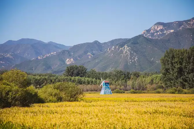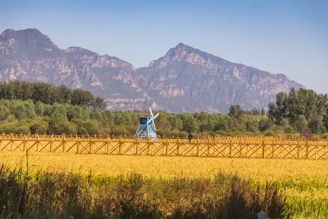 Putting the bicycles in a row on the edge of the field is also very ceremonial! The park has also thoughtfully built a plank road above the rice paddies, where you can walk up to enjoy the scenery or take photos of the rice paddies and the boardwalk together. There are windmills and waterwheels in the distance. Together, the golden rice fields sway gently at the foot of Haituo Mountain, creating a truly photogenic scene.