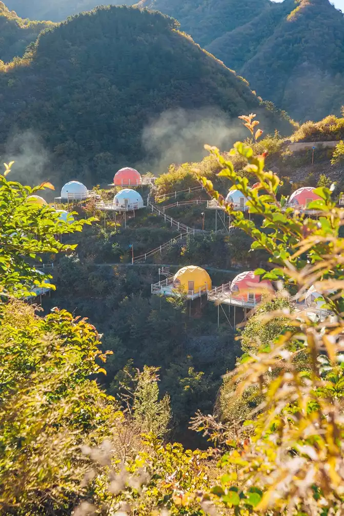 Wuling Mountain in Chengde is a national nature reserve and the closest one to the capital. Situated along the Andam River, the pristine landscape has nurtured generations of hardworking Da'anyu residents. Century-old chestnut orchards and hawthorn forests add to the beauty, delicious food, and joy of labor during autumn visits. Walking through the winding country road, you can see 15 adorable candy-colored bubble houses dotted among the mountains and forests. At the foot of the mountain, there is also a pure white Jiangnan Villa meticulously designed by a designer from Moganshan, which attracts many people.
