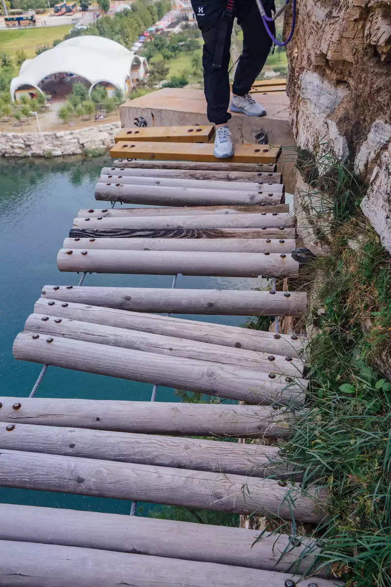 There's also an outdoor experience—cliff crossing—that offers a glimpse of this scenery. The total length is over 200 meters, suspended 100 meters above sea level. The entrance is at a suspension bridge, and the rest of the trail is very safe. You can ask staff for guidance and assistance. 99 yuan/person.