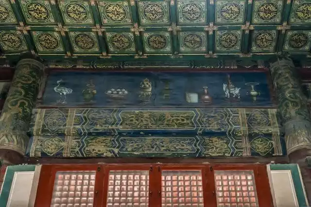 Entering the hall, I saw that it was indeed a bracket-type structure. Above is a double dragon and Hexi-style chessboard ceiling, the older one dating from the Qianlong period. Between the rafters, several Qianlong-era paintings, each in a unique style, are adorned with horizontal scrolls. These aren't Hexi-style or Su-style paintings, but rather individual depictions of flowers, birds, fish, insects, bottles, jars, and even a tray of soup dumplings.