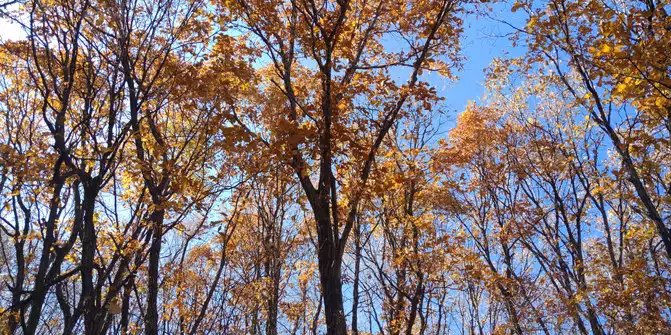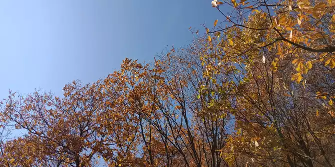 The strong tree trunks stretch out their arms to the sky, they also want to embrace the blue sky of autumn