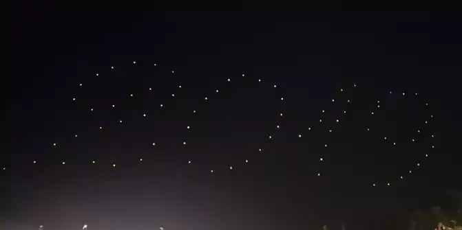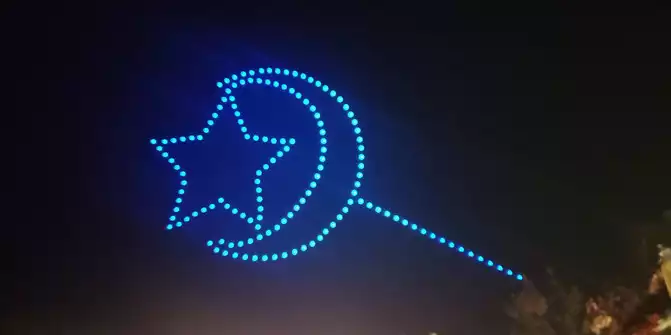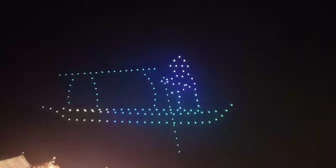 Drones gathered in the distance and then converged over the central square of the ancient town, forming different shapes.