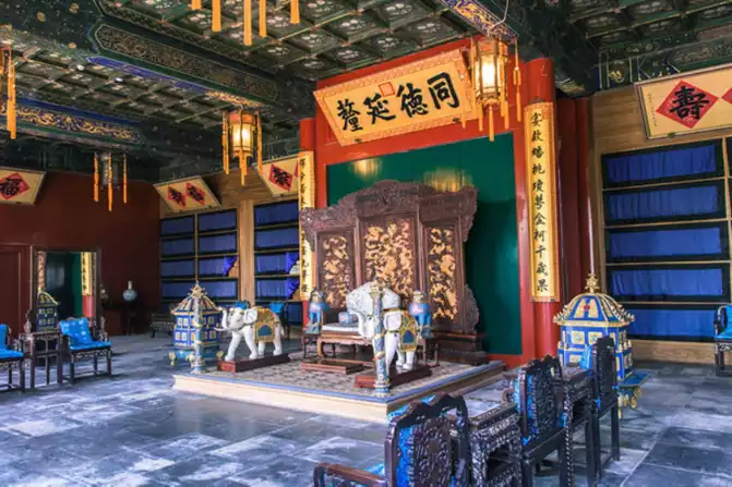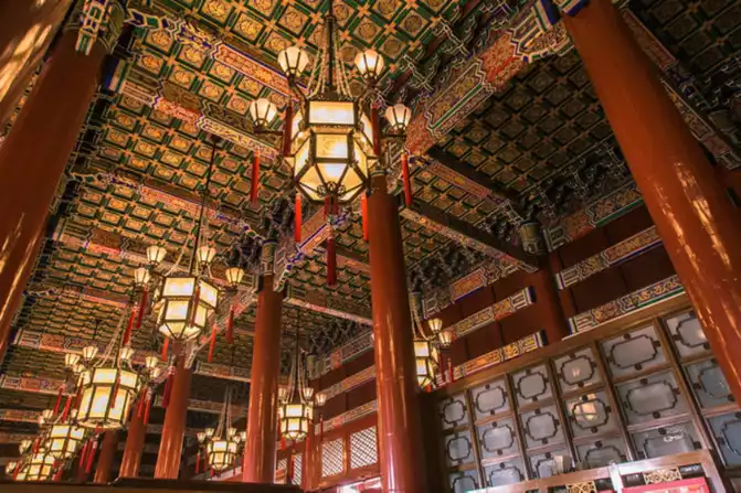 The Temple of Heaven is supported by 28 large golden nanmu pillars, which are arranged in a circle. The four central "Longjing Pillars", 19.2 meters high and 1.2 meters in diameter, support the upper eaves; the middle 12 golden pillars support the second eaves, which are painted with exquisite patterns using the method of gilding on a vermilion primer; the outer 12 eaves pillars support the third eaves; a three-tier ceiling is set up accordingly, with a dragon and phoenix caisson in the middle; the beams and rafters in the hall are painted with dragons, phoenixes and imperial seals. The four "Dragon Well Pillars" in the middle of the Hall of Prayer for Good Harvests symbolize the four seasons of the year; the twelve large pillars in the middle layer are slightly thinner than the Dragon Well Pillars and are called Golden Pillars, symbolizing the 12 months of the year; the 12 pillars on the outer layer are called Eaves Pillars, symbolizing the 12 hours of the day. There are 24 pillars on both the Chinese and Western sides, symbolizing the 24 solar terms.