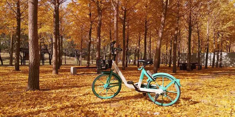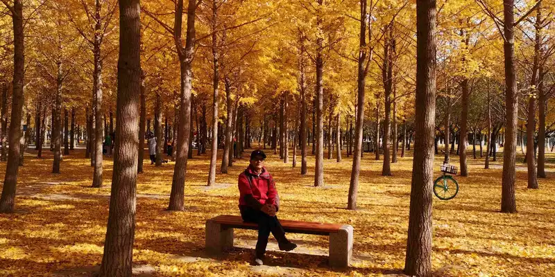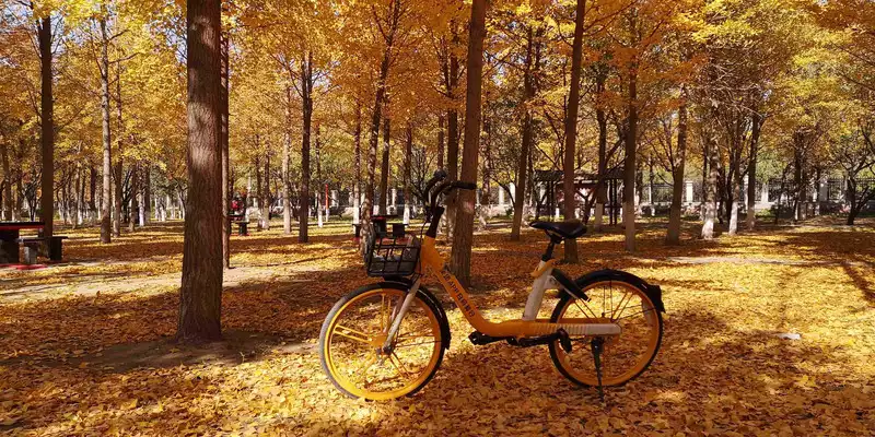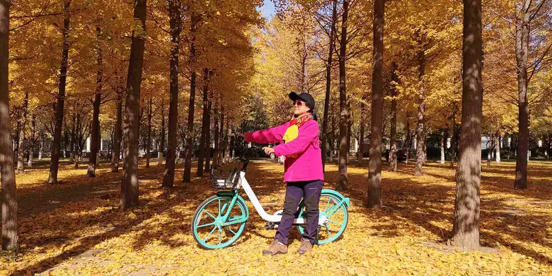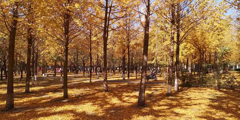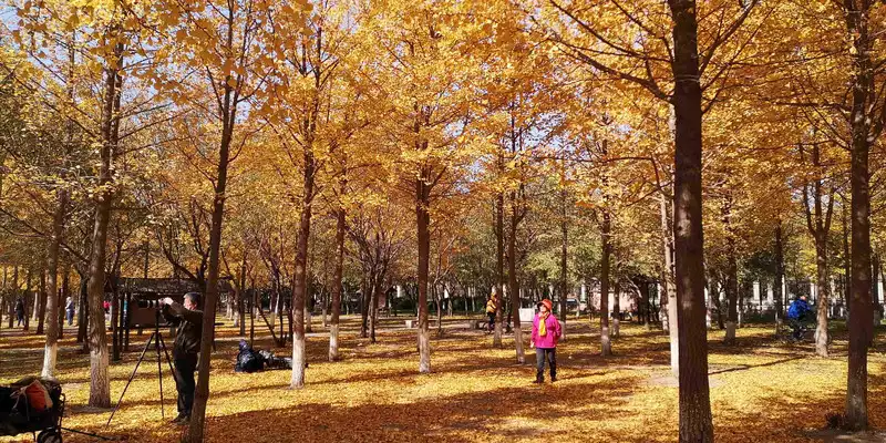 The golden color covering the trees and the ground transforms Tianyuan Park into a golden dreamland. There are no buildings or service facilities around the ginkgo forest. Many tourists rode their shared bikes directly into the ginkgo forest.