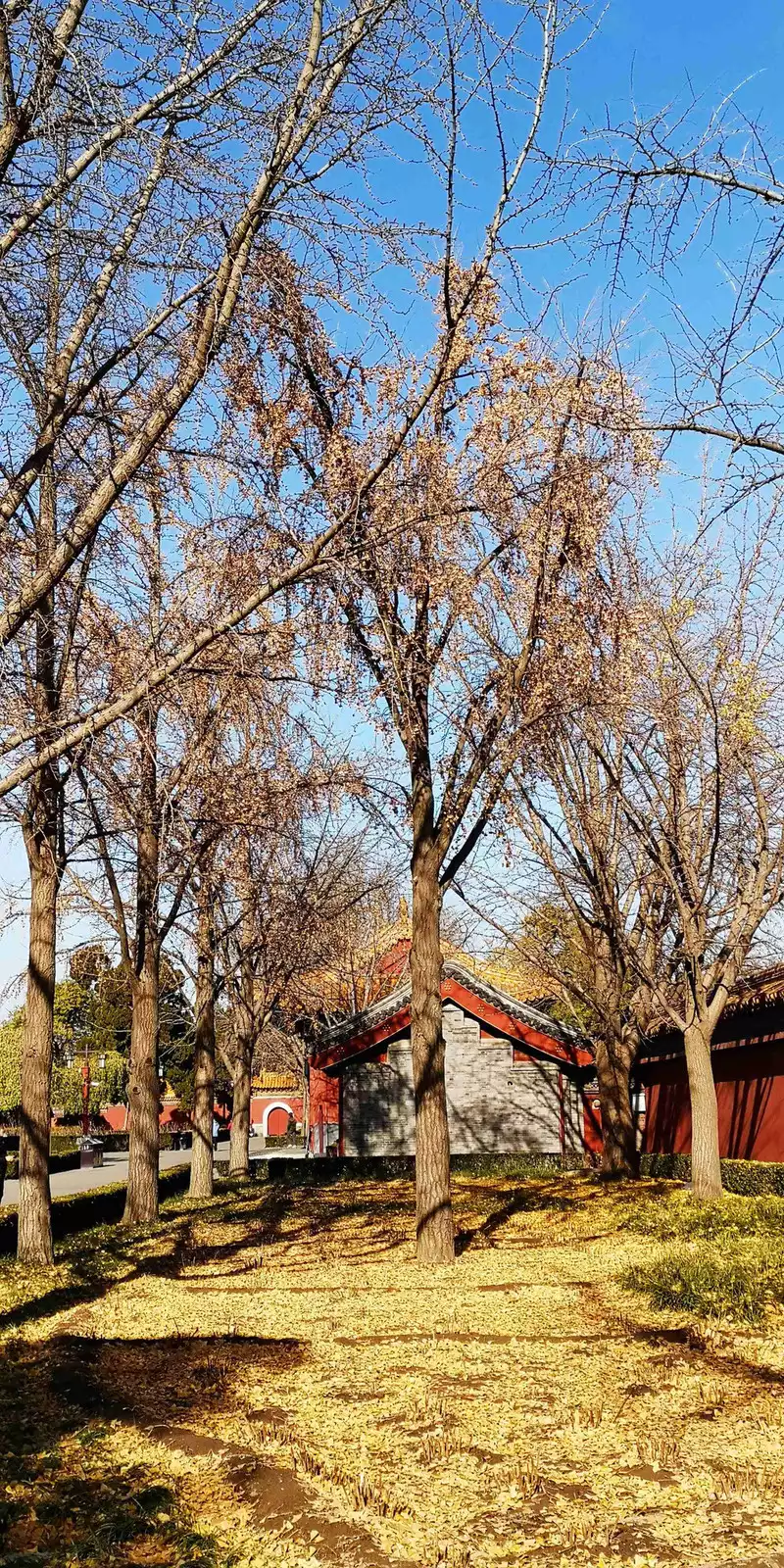 The blue sky and yellow leaves spread all the way through the ancient altar and temple, as if the road was paved with gold.