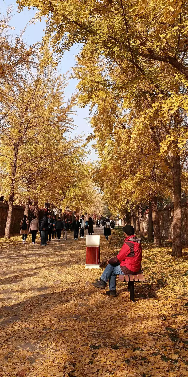 The straight Ginkgo Avenue was filled with people, young and old admiring the apricot leaves, photographers with their cameras, and painters with their sketchpads, becoming a part of the forest scenery.