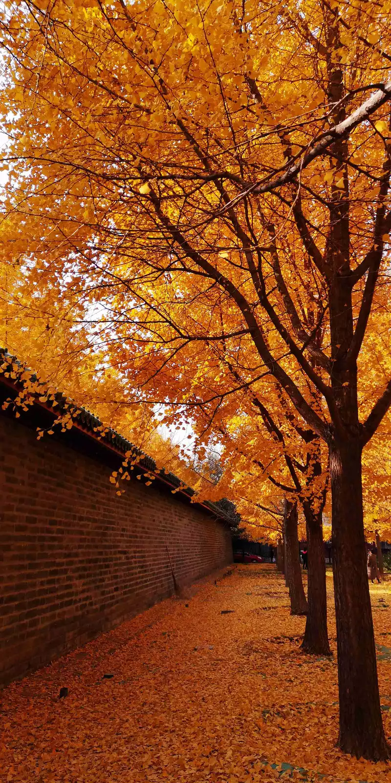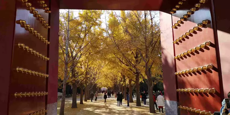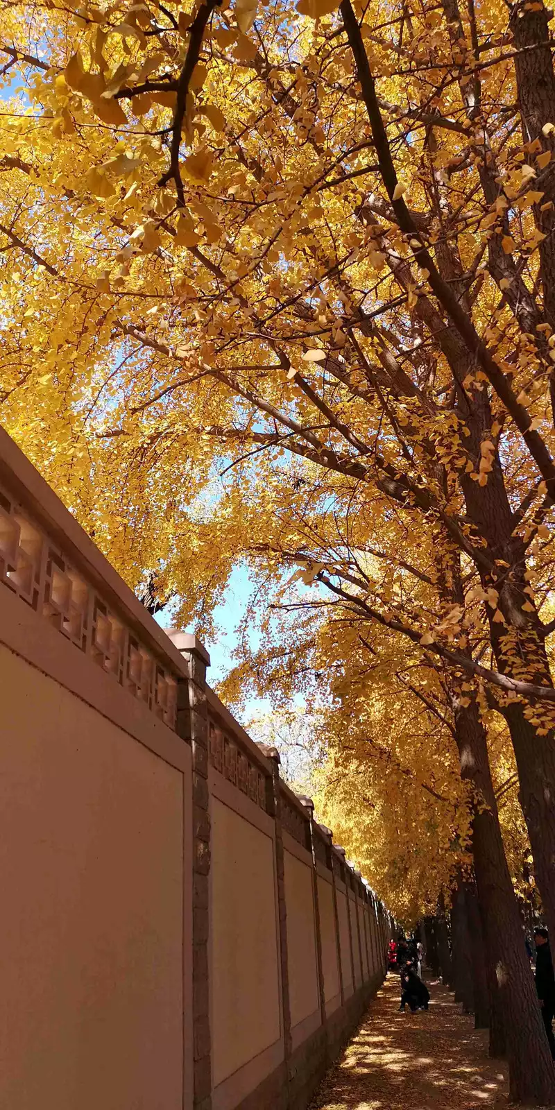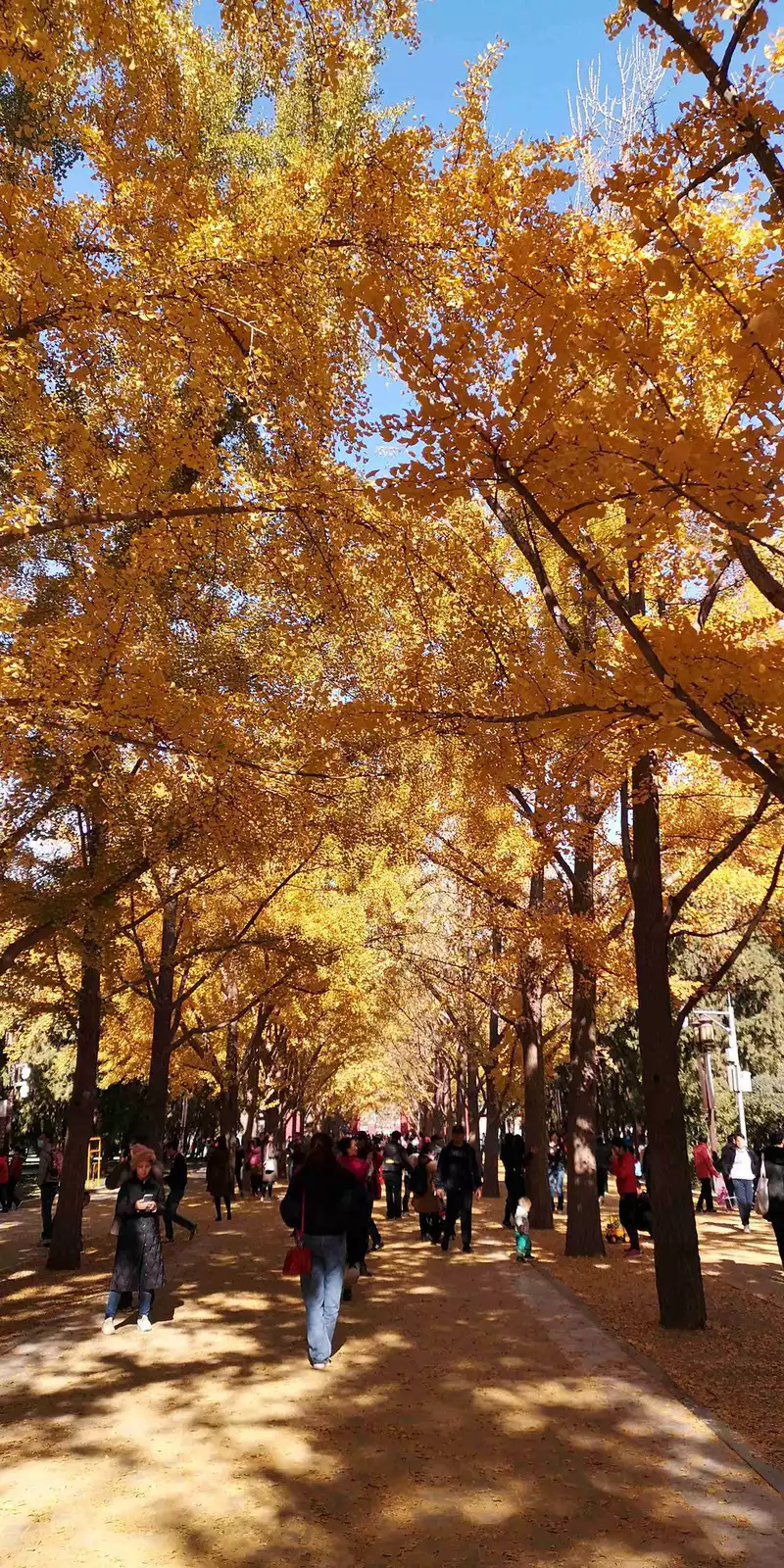 The Ginkgo Avenue in Ditan Park and the Ginkgo Avenue in Lama Temple are very close and can be viewed together. The ginkgo trees along Lama Temple's Ginkgo Avenue are in their prime, with each tree over 30 years old, resulting in a tall and dense appearance.