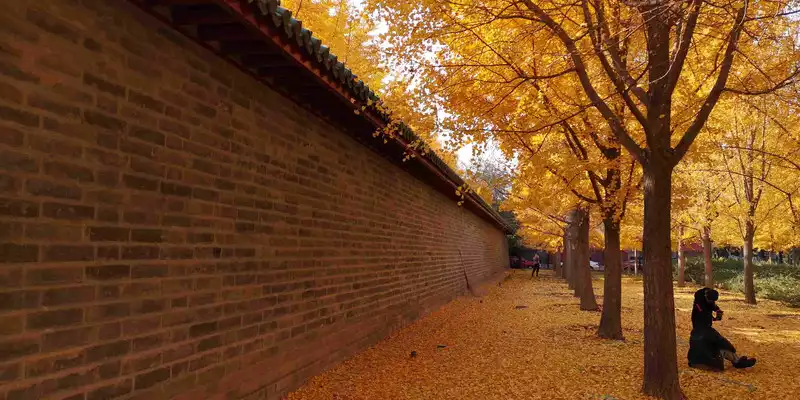 Because fallen ginkgo leaves aren't cleaned up, the roads are covered in golden color. Stepping on the golden leaves makes a crisp sound, and the eyes are filled with the opportunity to capture beautiful moments.