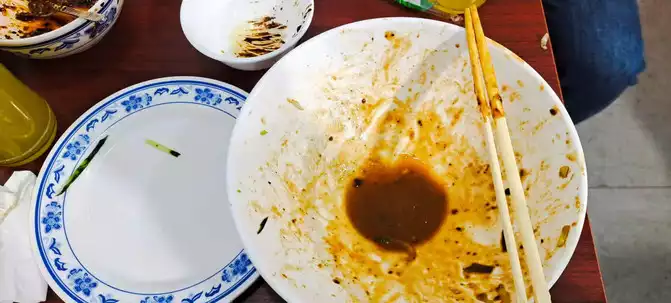 Across from us sat two young men, students currently attending school in Beijing, wolfing down their food with relish! The waitress passed by and took a moment to say, "Eat slowly, don't choke. If you don't have enough, you can get more noodles or sauce for free, but don't leave any leftovers."