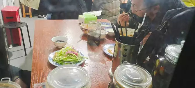 We walked like this for about half an hour. We saw dozens of people queuing at a street corner. Through the window, we could see it was packed inside, each person eating from a large bowl. The windowsill was neatly lined with jars of already green Laba garlic, tempting us to move closer to take a closer look.