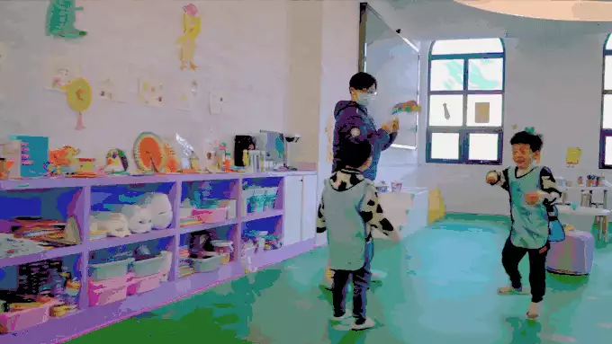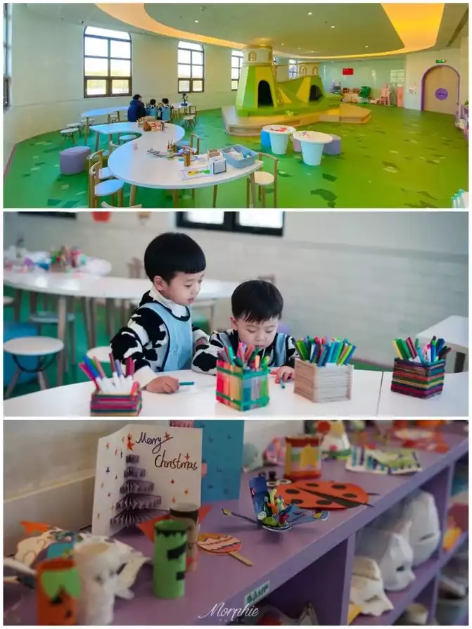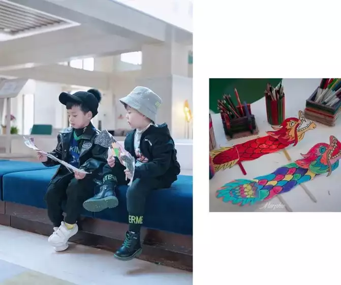 In the artistic art room, children can experience a variety of DIY activities, such as mask painting, dragon dancing, paper dolls, necklace making, and even making cookies.