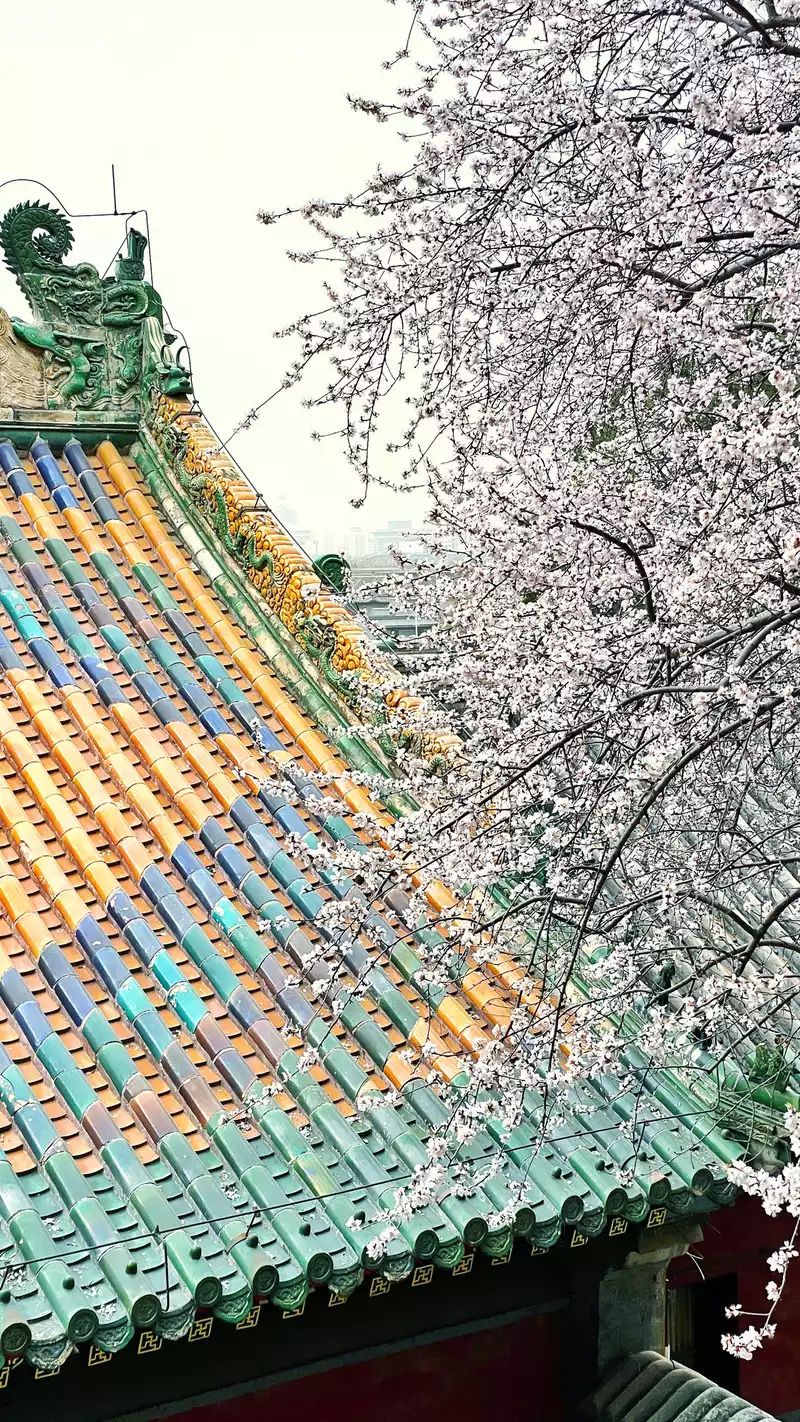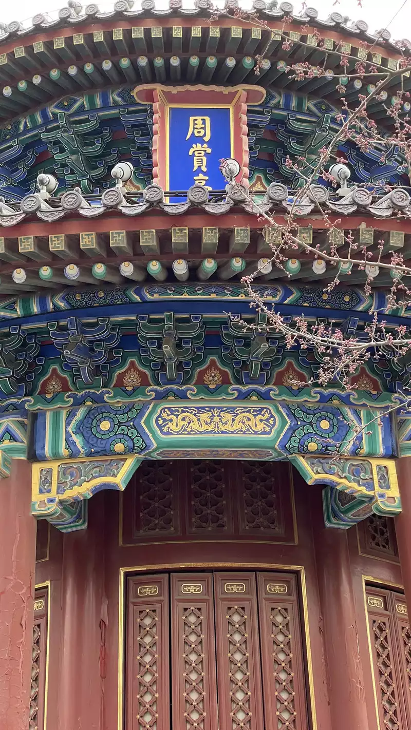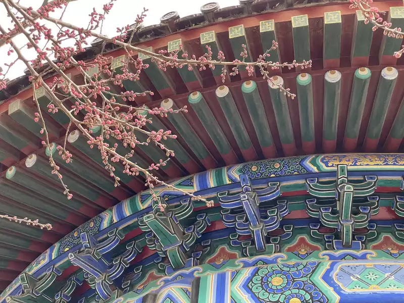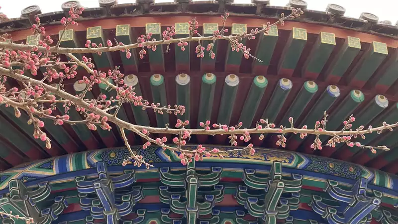 My goal was to reach the top to see the Forbidden City. As I climbed, I saw several rest pavilions on the upper slopes, which, paired with the early spring wild peach blossoms, were also enchanting. Jingshan Park Jingshan Park