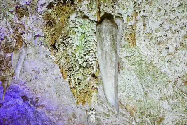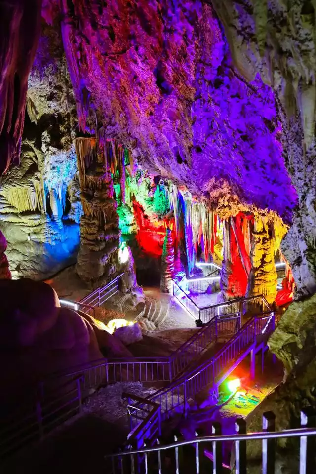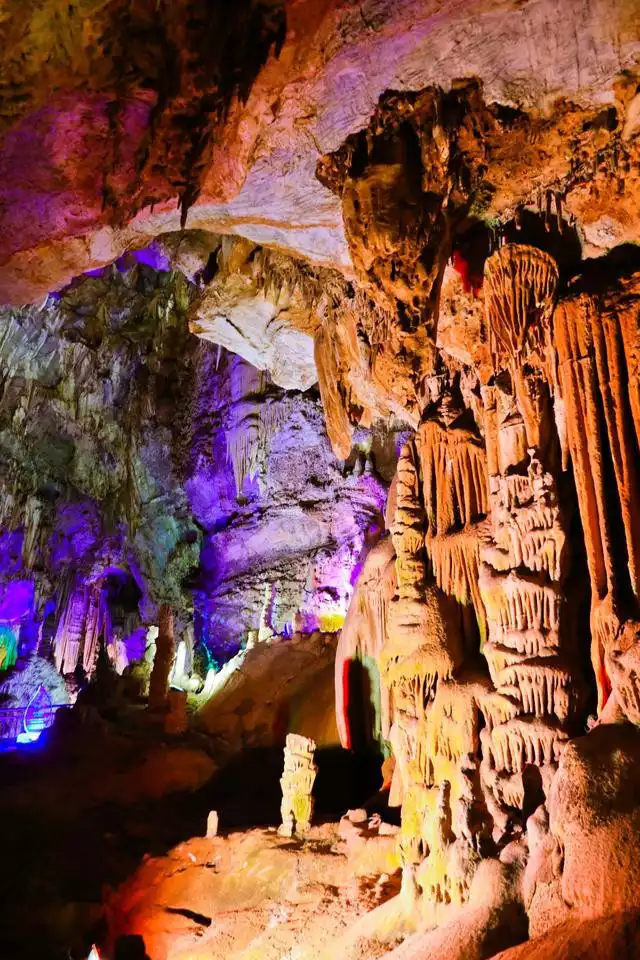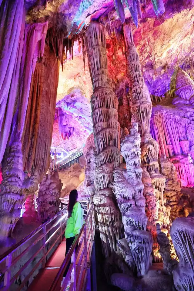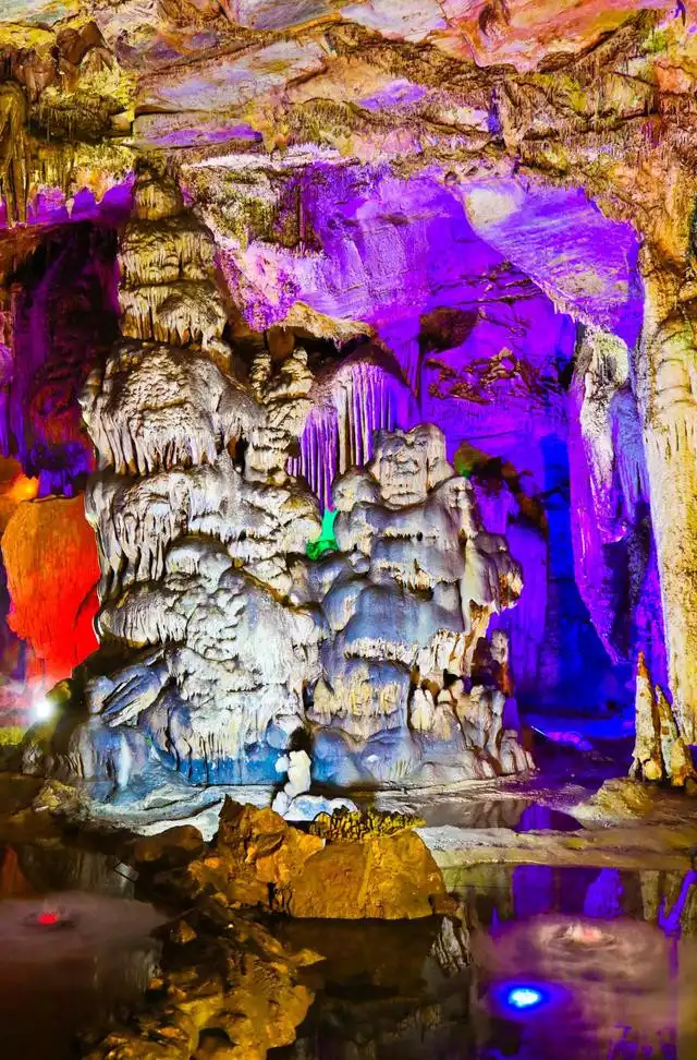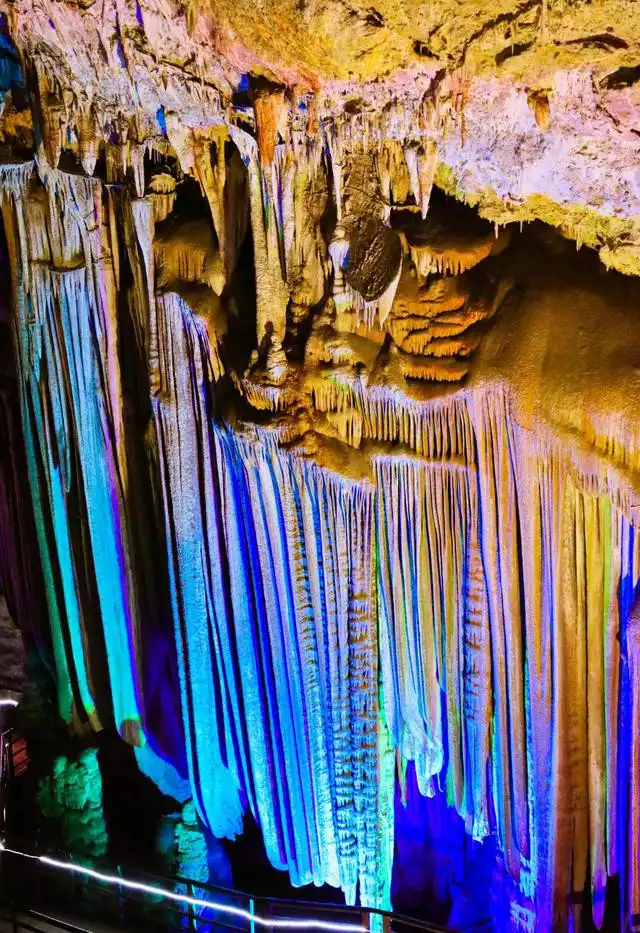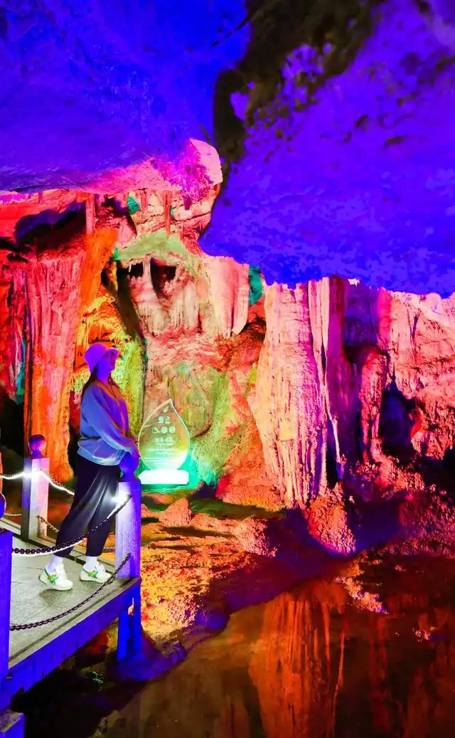 Located at the deepest part of the west branch cave on the second level, it is a stone waterfall formed by water deposition. The upper water rich in calcium carbonate gushes down along the cracks in the cave wall. During the gust, the calcium carbonate in the water gradually settles with the water flow, forming a stone waterfall 10 meters high and more than 20 meters wide. What tourists can see now is only one-third of the waterfall. The other two-thirds extend inside the cave. This is the largest stone waterfall in the cave, named "Tengliu Waterfall" because of its shape resembling tumbling water. Located in the central hall on the second floor, this is the cave's largest stalactite. Formed by dripping and flowing water, it grows downward from the cave's ceiling. Standing 18 meters tall and 3 meters wide, it resembles an inverted, blazing torch, earning the name "Inverted Torch." Located at the base of the second layer, a magnificent stone curtain forms the largest formation within the cave. Formed by dripping, linear, and sheet-like water deposited along the cave walls, the curtain stands 10 meters high and 18 meters wide, comprising 540 pieces. Known as the "Dragon Palace Harp" or "Dragon Palace Curtain," it is located at the base of the second layer.