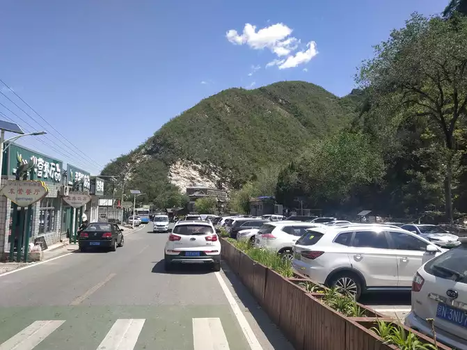 This is the uphill road next to the scenic area parking lot. The parking lot is on the left, and the roadside restaurant is on the right. You can see many shuttle buses along the way.