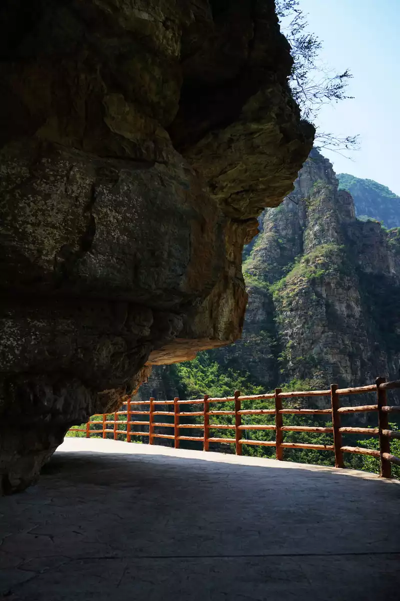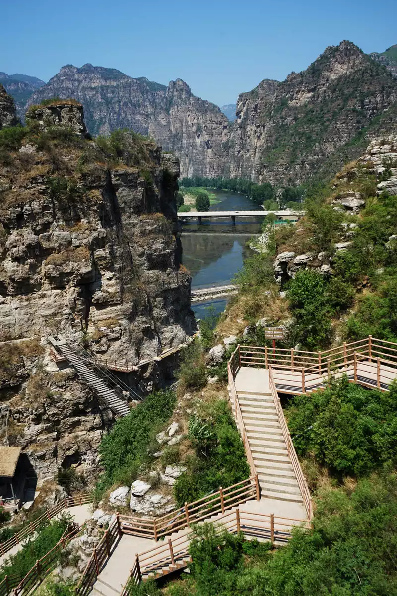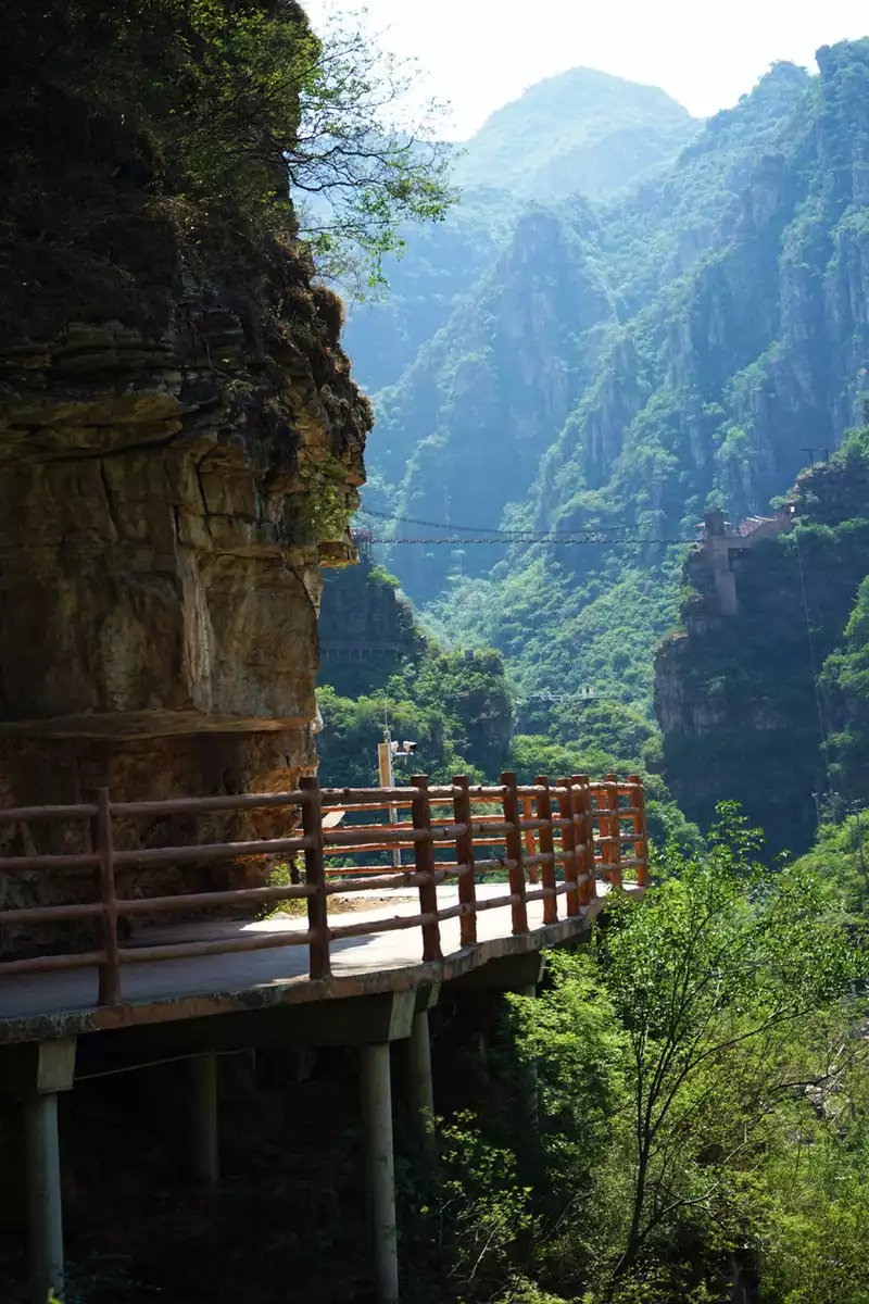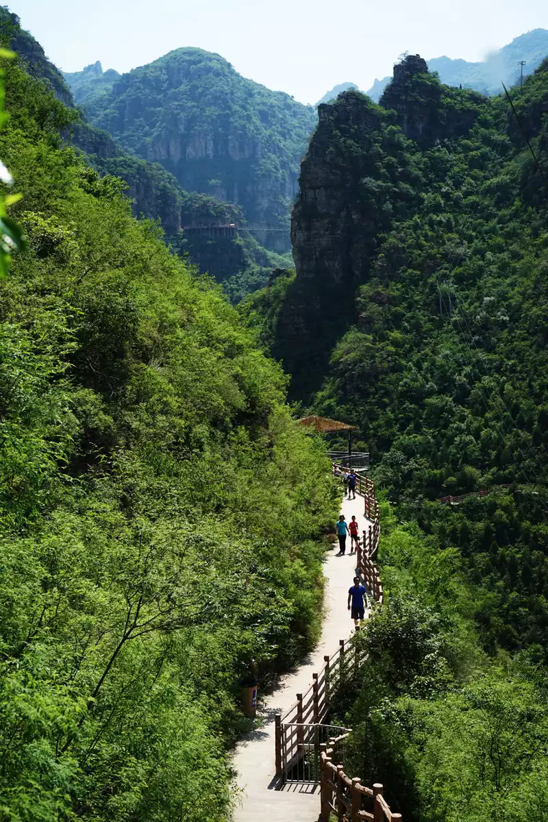 We put on shoe covers at the entrance and then stepped onto this glass plank road which is said to be the longest, most dangerous, most thrilling and with the largest drop in height in North China. You know what? Walking on it does feel a bit unsettling. Looking up, you're greeted by peaks and white clouds, while looking down, you're faced with the abyss, the Juma River reduced to a narrow stream. Putting aside the fear, the view is filled with scenery: towering mountains and forests, a gentle breeze. Honestly, I didn't encounter any male tourists who cried out in fear on the glass plank road, but some people do walk very cautiously.