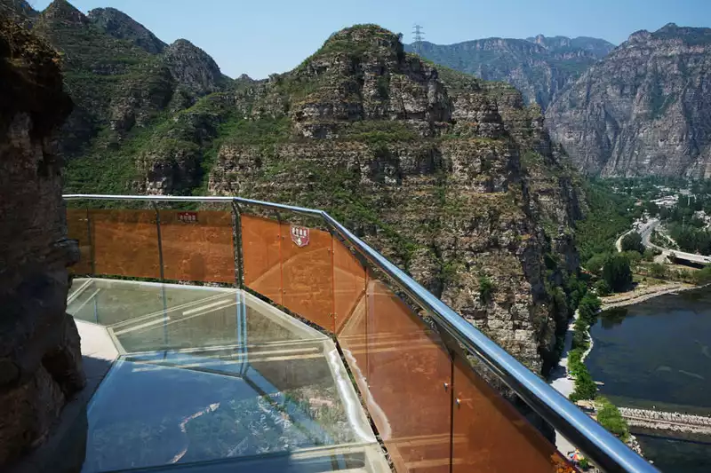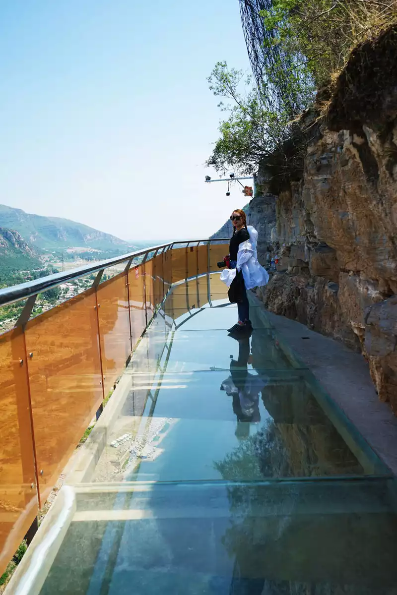 This cliff trail is about 100 meters long and is divided into 8 small sections. It almost circles the mountain. There are big gaps between the wooden boards. It is really hard to look down when walking on it. After crossing the cliff, continue to go up the steps, and you will reach the cliff glass plank road. As the name suggests, it is a plank road built with glass on the cliff. For friends who often travel, such projects may not seem unfamiliar, but for the timid, it seems like an insurmountable obstacle. We put on shoe covers at the entrance and then stepped onto this glass plank road which is said to be the longest, most dangerous, most thrilling and with the largest drop in height in North China.