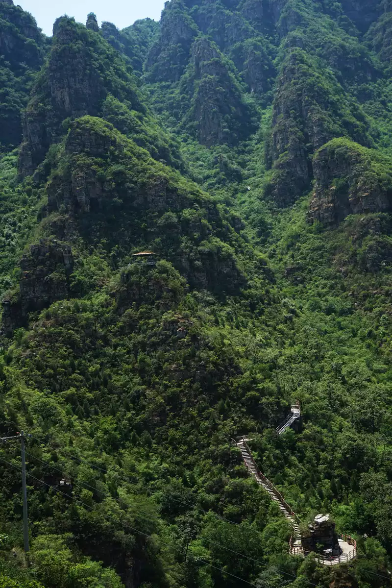 The winding mountain trails here are also uniquely charming. Walking through them, you feel like you're in a vast, verdant world. The path up the mountain seems to flatten out after descending the glass plank road. While still winding along the cliff face, the experience is completely different. While the previous cliff crossings and cliff glass plank roads were thrilling, the trail built into the cliff face is tranquil and beautiful. Every turn is a scene. The canyon breezes, the peaks and ridges overlap, and the protruding rocks, some resembling the Zhoukoudian Ape Man, others standing like millennia-old sculptures, gaze out into the distance, deep valleys lush with vegetation, birds chirping from branches and landing on the rocks. In the distance, the mountains undulate in the wilderness, rugged and solid.There are two mountain peaks in the distance, one is called Tianzi Peak and the other is called Qingren Ridge. The former has cliffs thousands of feet high, and the latter has cliffs several feet high. In the middle is an unfathomable valley. Between the two peaks is a 158-meter-long glass suspension bridge with an altitude of more than 300 meters. Many people may not have a feeling about the height of more than 300 meters, but if you know that the altitude of Beijing city is 43.5 meters, perhaps you will have some specific concept.