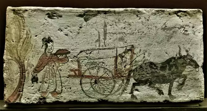 The Ox Cart Brick depicts a man driving an ox cart, followed by a maid holding a tray in one hand and a flat pot in the other.