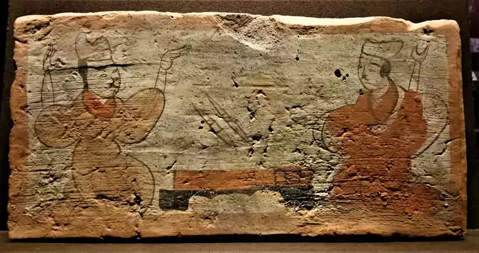 A painting depicts two musicians sitting opposite each other playing music. The man on the left presses and rubs the strings with his left hand, plucking with his right, while the man on the right holds a sanxian (three-stringed ruan) and plays the instrument. The brick depicting the character "兀" (dock) depicts a city gate, a watchtower above, battlements on the city walls, and trees, cattle, horses, and sheep outside the dock. The character "兀" is inscribed on the brick. The left side of the brick depicts a dock, which is square in plan, surrounded by tall walls and square corner towers. On the right, two figures in red and white stand guard, holding spears.