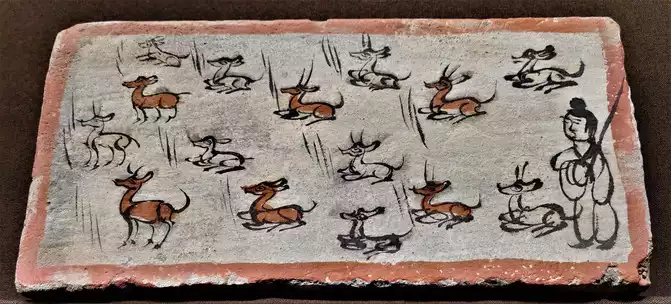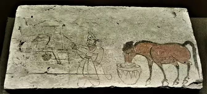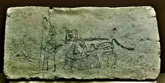 The painting depicts a man leading a horse with a hound following in the distance, perhaps depicting a servant preparing a horse for hunting for his master. The tomb owner is depicted traveling in a chariot, accompanied by a charioteer and followed by servants. This depiction showcases the tomb owner's dignified demeanor and reflects his social life. This brick depicts a warrior clad in armor, armed with a bow and arrows, and wearing combat boots. He holds a spear in one hand and leads his warhorse in the other, preparing to depart for battle.