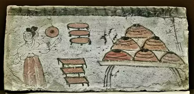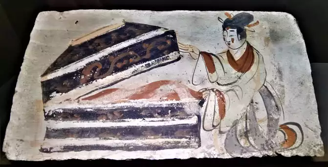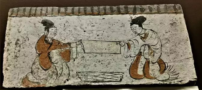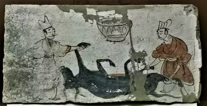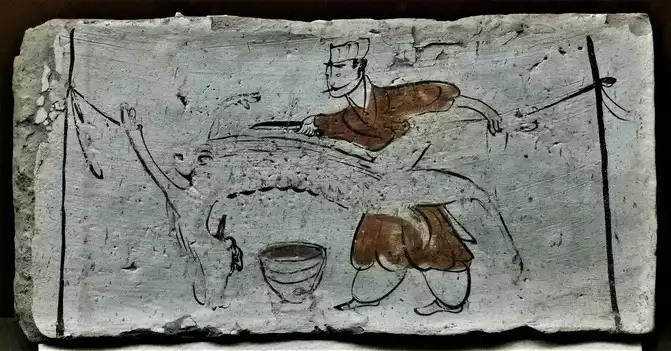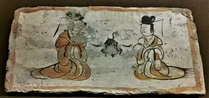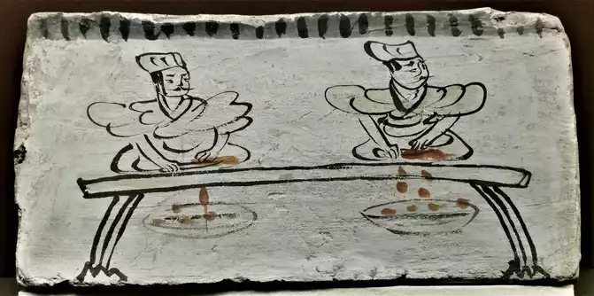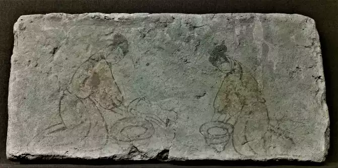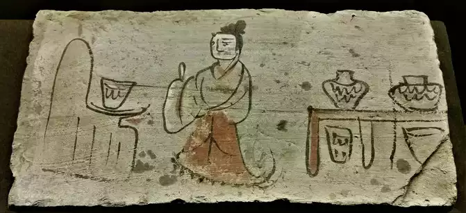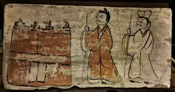 Inside a banquet curtain, four men kneel side by side on the left, while two musicians kneel on the right, playing recorders and ruanxian. In the center are wine vessels such as ear cups and zun. The tomb depicts a servant offering grilled meat to his master. The servant grills the skewers on a rectangular stove, while the master, wearing a black cap, holds a plate and noodles. The inscriptions "Youjie" and "Duanqing" are inscribed on the tomb's left and right, respectively. Duanqing is likely the tomb owner's name, and Youjie was his courtesy name. A scene depicting Liubo: One man raises his hand to throw two zi, while another man raises his left hand high and points his right hand toward the board. The two men move the pieces by matching each other's zi. This type of game is known as "Liubo" in the traditional Chinese game.
