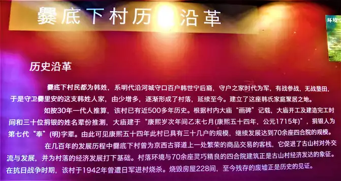The village boasts over 70 courtyards and nearly 700 buildings, most dating from the late Qing Dynasty. The stacked, blue-brick, gray-tiled houses, scattered across the hillside and valley floor, imbue the village with a time-honored charm. Strolling through the village and taking photos is a delightful experience. The village's historic buildings are also accessible for visitors.